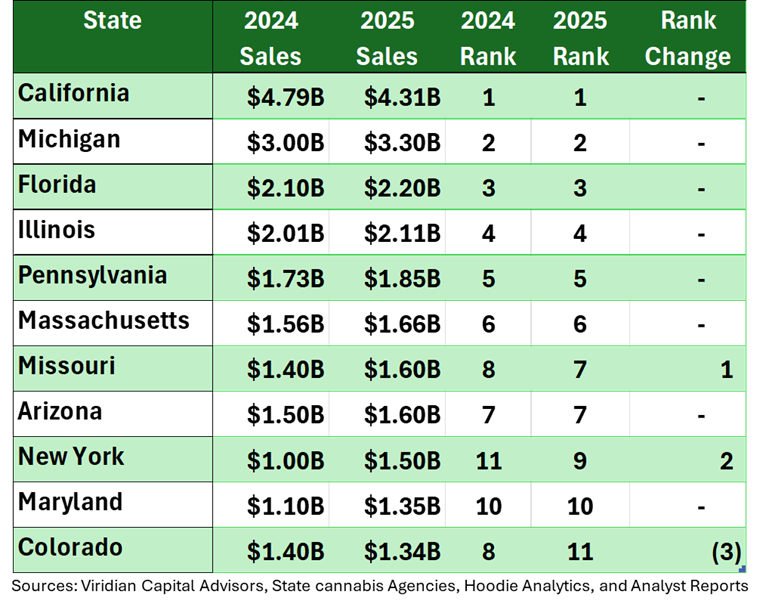- Growth and Profitability: Industry growth is slowing. 2025 is expected to show declining revenues among top MSOs, with only ~7% rebound projected in 2026 as Pennsylvania, Virginia, or Florida flip to adult use. Long-term growth is CPG-like (population + inflation) as the illicit market is converted to a legal one.