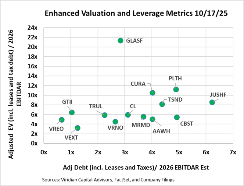 - The first graph presents our latest view of the most appropriate valuation and financial statement-based leverage metrics: Adjusted Enterprise Value (EV) / 2026 EBITDAR and Adjusted Net Debt / 2026 EBITDAR. In calculating Adjusted Net Debt, we make several key assumptions: 1) Leases that are included on the balance sheet are considered debt. We view most leases in the cannabis space as equivalents to equipment loans or mortgage loans. While it is true that a lease default does not necessarily trigger a cascade of events leading to bankruptcy, the distinction is often meaningless in the Cannabis Industry due to the mission-critical nature of many long-term leases and the absence of bankruptcy protection in This Sector. 2) We consider any accrued taxes (including uncertain tax liability accounts listed as long-term liabilities) in excess of the most recent quarterly tax expense to be debt. Our calculation of enterprise value is now market cap plus debt plus leases plus tax debt minus cash. We now use EBITDAR rather than EBITDA, as lease expense is deducted prior to calculating EBITDA.