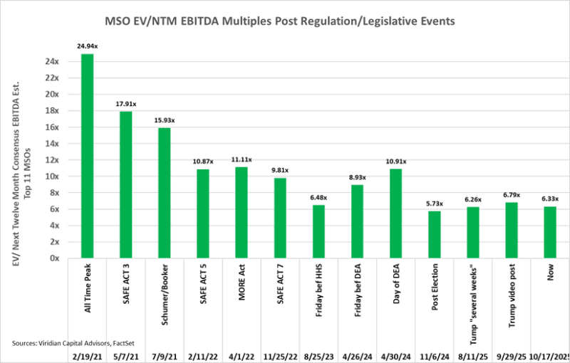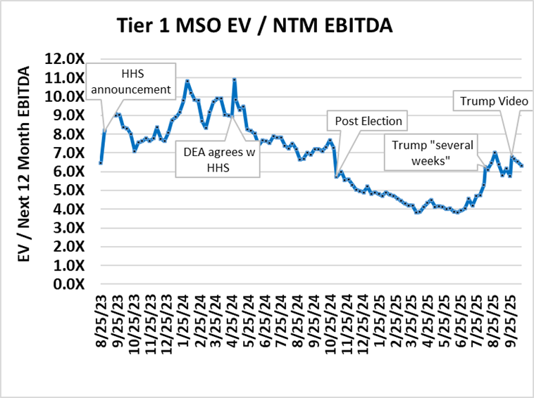 - The chart below shows aggregate enterprise value to next twelve months consensus EBITDA projections for the six of the top MSOs, including Curaleaf, GTI, Trulieve, Verano, Cresco, and TerrAscend from 8/25/23 (the Friday before the HHS announcement) through 9/29/25 (The Trump Video Post)