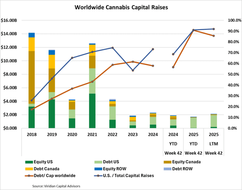 - Much has been made of the upcoming wave of cannabis debt maturities in 2026. The sheer size is undoubtedly intimidating. The companies pictured on the graph below collectively have approximately $1.5 billion of debt maturing in 2026. (IAnthus maturities are actually in 6/27, but close enough!). This figure used to be over $2.3 billion, before Gold Flora, 4Front, and AYR flamed out, and we recently added Shwazze to the list. Cresco agreed to refinance its secured term loan. Putting that figure into perspective, $1.53B is still more than total cultivation & retail sector capital raises for any year since 2019, except for 2021 ($4,8B) and 2022 ($1.7B)