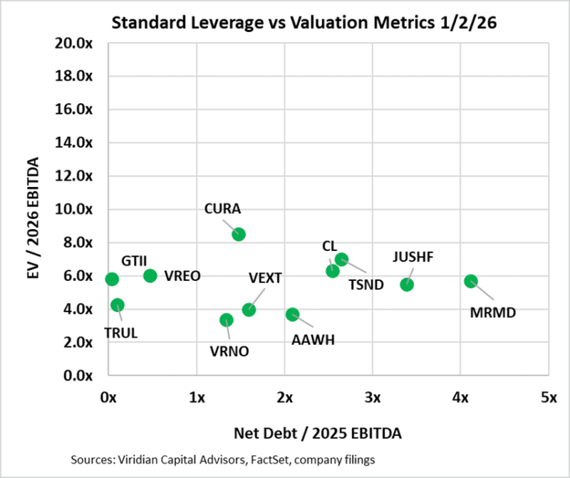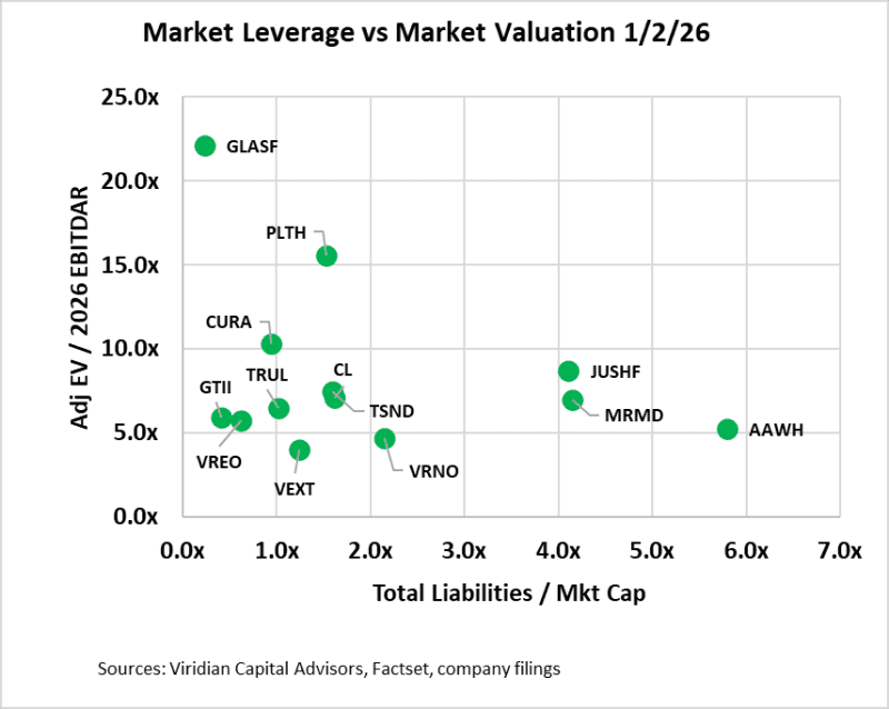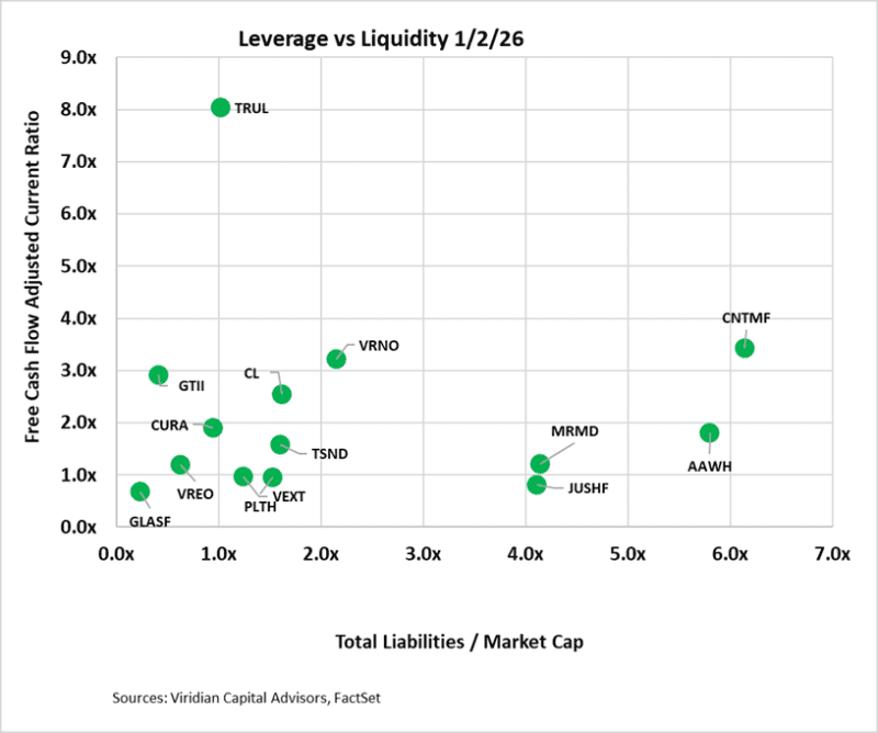 - On the bottom left are companies with an Adj. EV/2025 EBITDAR ratio of under 9x and total liabilities to market cap of under 2x. The group includes GTI, Vireo, Trulieve, Verano, Cresco, TerrAscent, and Vext. Companies in this quadrant are right to consider stock repurchases or using cash in acquisitions. They can afford some additional debt and can take advantage of the ongoing dislocation in equity prices.