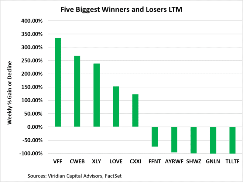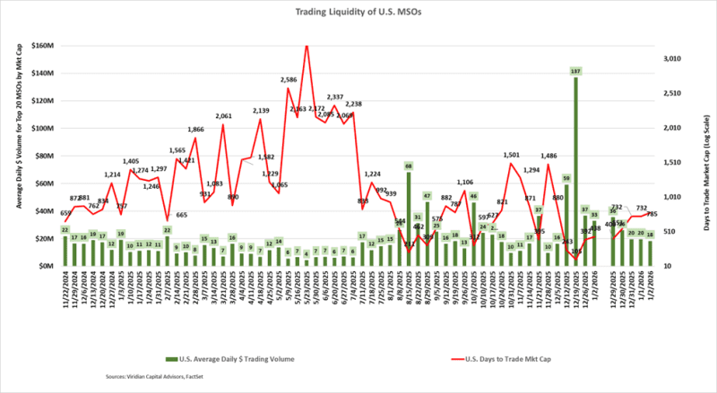 - The average daily dollar volume of $37 million for the week ending December 26, 2025, was reduced by the holiday-shortened week but is still quite respectable. The current Days to Trade the Market Cap (DTTMC) of 392 means that an investor who acquired a 5% position in the stock, assuming they wanted to be less than 25% of the average daily dollar volume, would require 78 days to trade out of their position. This is excellent liquidity by cannabis market standards.