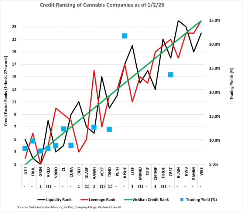 - The Chart below displays our updated credit rankings for 25 U.S. cannabis companies as of December 26th, We have reduced our ranking set from 30 to 24 companies by eliminating AYR, CLS, FFNT, GRAM, SHWZ, and Tilt. Each of these companies is either in receivership (FFNT, GRAM), in restructuring discussions (AYR & SHWZ), or has out-of-date financials (AYR, FFNT, GRAM, SHWZ). Additionally, each trade is significantly out of the money, with stock price movements driven primarily by volatility rather than valuation.