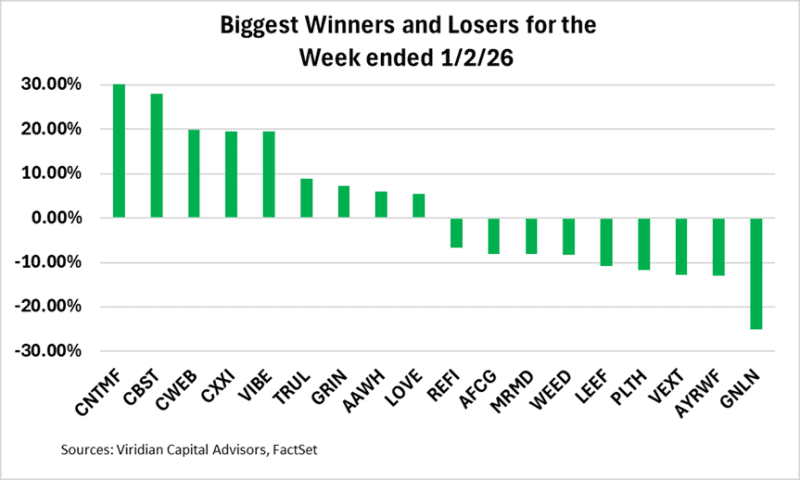 - Cannabis equity prices (as measured by the MSOS ETF) fell by 0.4% for the week.
