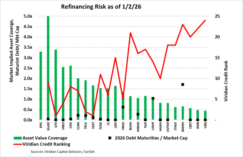 - Conversely, the companies on the left-hand side of the graph represent lower refinancing risk. They have solid asset coverage, strong Viridian Credit Ranks, and maturing debt that is less than 1.25x times their market capitalization. These companies represent $1.36 billion of the $1.53 billion total (70%), and we believe they should all be able to refinance their maturities without undue hardship. The offered side quotes on Curaleaf, Verano, and Trulieve—the solid credit MSOS with the most remaining 2026 maturities—tightened significantly after the Cresco deal. Investor psychology appears to have shifted, with a growing belief that these names can refinance their maturities without undue hardship.