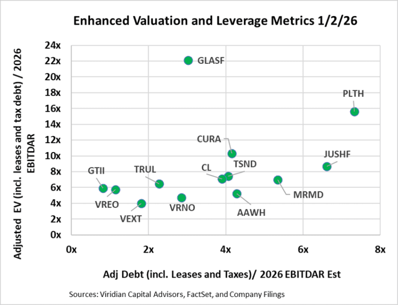 - The first graph presents our latest view of the most appropriate valuation and financial statement-based leverage metrics: Adjusted Enterprise Value (EV) / 2026 EBITDAR and Adjusted Net Debt / 2026 EBITDAR. In calculating Adjusted Net Debt, we make several key assumptions: 1) Leases that are included on the balance sheet are considered debt. We view most leases in the cannabis space as equivalents to equipment loans or mortgage loans. While it is true that a lease default does not necessarily trigger a cascade of events leading to bankruptcy, the distinction is often meaningless in the Cannabis Industry due to the mission-critical nature of many long-term leases and the absence of bankruptcy protection in This Sector. 2) We consider any accrued taxes (including uncertain tax liability accounts listed as long-term liabilities) in excess of the most recent quarterly tax expense to be debt. Our calculation of enterprise value is now market cap plus debt plus leases plus tax debt minus cash. We now use EBITDAR rather than EBITDA, as lease expense is deducted before EBITDA is calculated.