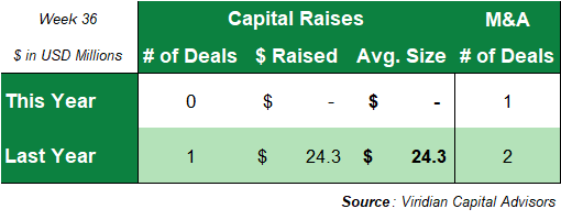 • No capital raises occurred during the week ended September 5th, 2025. Last week saw two raises, totaling $95.0 million in value. This week last year had one raise, with a total value of $24.3 million.