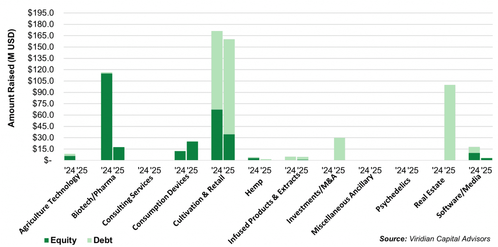 The Year-to-Date Charts for Capital Raises includes a detailed breakdown of capital raises in the cannabis industry year to date, and as compared to prior year periods. This provides a flow of funds analysis for investors. Charts include a breakdown between Public and Private capital raises, Equity & Debt raises, and capital raises by industry sector.